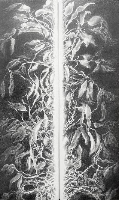 In my drawing there is one tiny leaf, this is the moment that we live in, and that present is created and enhanced and given meaning by all that has come before, the shadows of our past and the dreams of the future.